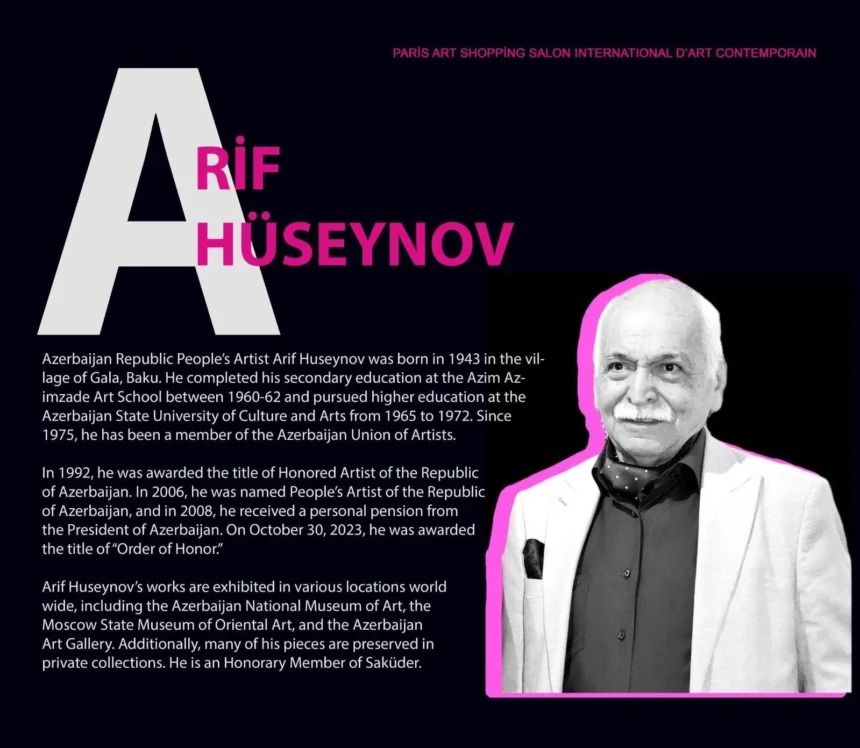 Heute befinden sich Arif Huseynovs Werke im Staatlichen Kunstmuseum Aserbaidschans, in der Staatlichen Kunstgalerie Aserbaidschans, im Staatlichen Museum der Völker des Ostens in Moskau sowie in zahlreichen privaten Sammlungen. Seine künstlerische Ausbildung erhielt er zunächst an der Staatlichen Kunstschule Aserbaidschans, benannt nach A. Azimzade. Später absolvierte er die Staatliche Universität für Kultur und Kunst Aserbaidschans. Seit 1975 ist er Mitglied des Künstlerverbandes.