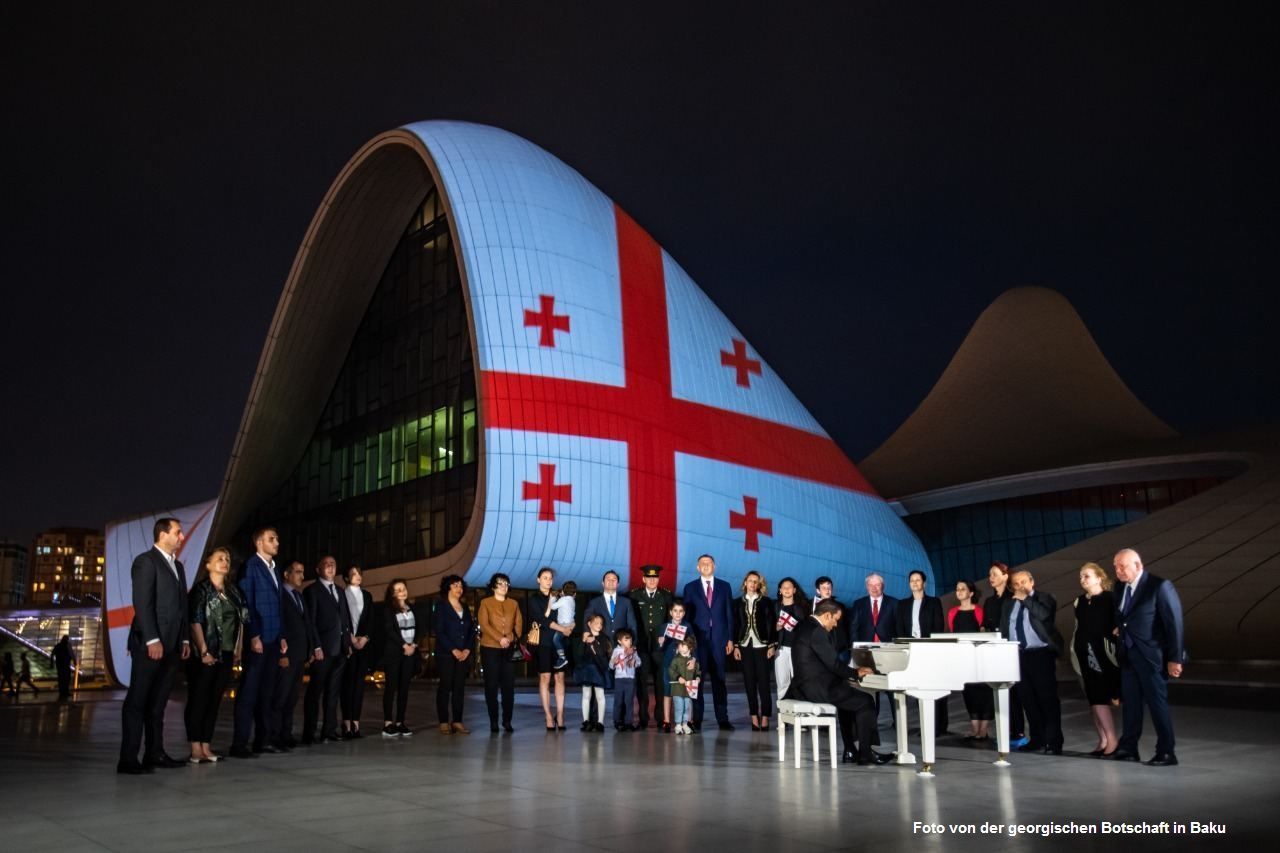 Während der Videoprojektion unter Beteiligung der Mitarbeiter der georgischen Botschaft in Aserbaidschan wurden die Nationalhymnen von Aserbaidschan und Georgien vor dem Zentrum gespielt.