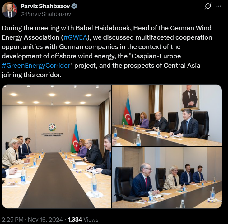 Während der COP29-Konferenz unterzeichneten SOCAR Green, die Tochtergesellschaft von SOCAR, Siemens Energy und Nobel Energy eine Absichtserklärung zur gemeinsamen Entwicklung erneuerbarer Energieprojekte, zur Verbesserung der Energiesicherheit und zur Beschleunigung der Energiewende in der Region. Minister Schahbazov traf sich während der Konferenz mit Bärbel Heidebroek, der Präsidentin des Bundesverbands Windenergie (GWEA), um Aserbaidschans grüne Energiewende und den Fortschritt der Projekte „Grüner Energiekorridor Kaspien-Europa“ und „Grüner Energiekorridor Zentralasien-Aserbaidschan“ zu besprechen. Beide Seiten erkundeten außerdem Möglichkeiten einer Zusammenarbeit mit deutschen Unternehmen bei der Entwicklung der Offshore-Windenergie und bei Projekten im Bereich grüner Energiekorridore.
